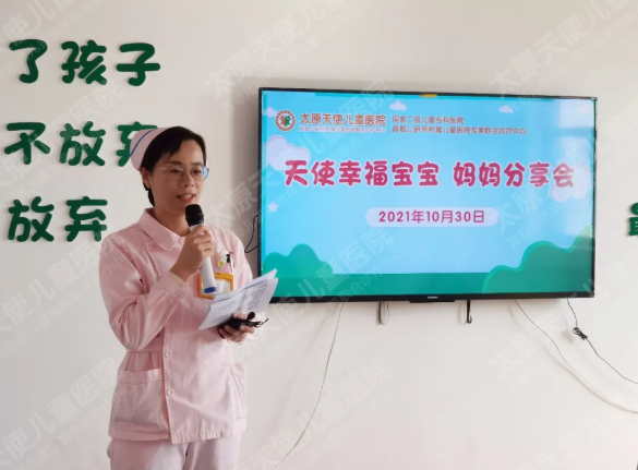 10月30日上午,太原天使儿童医院举行了深秋场“天使幸福宝宝——妈妈分享会”,十余位正在太原天使接受住院康复治疗的患儿家长参加了分享会。在妈妈分享会上,主持人—住院部魏护士长与家长朋友们共同探讨了“如何培养一个幸福的孩子”的话题。