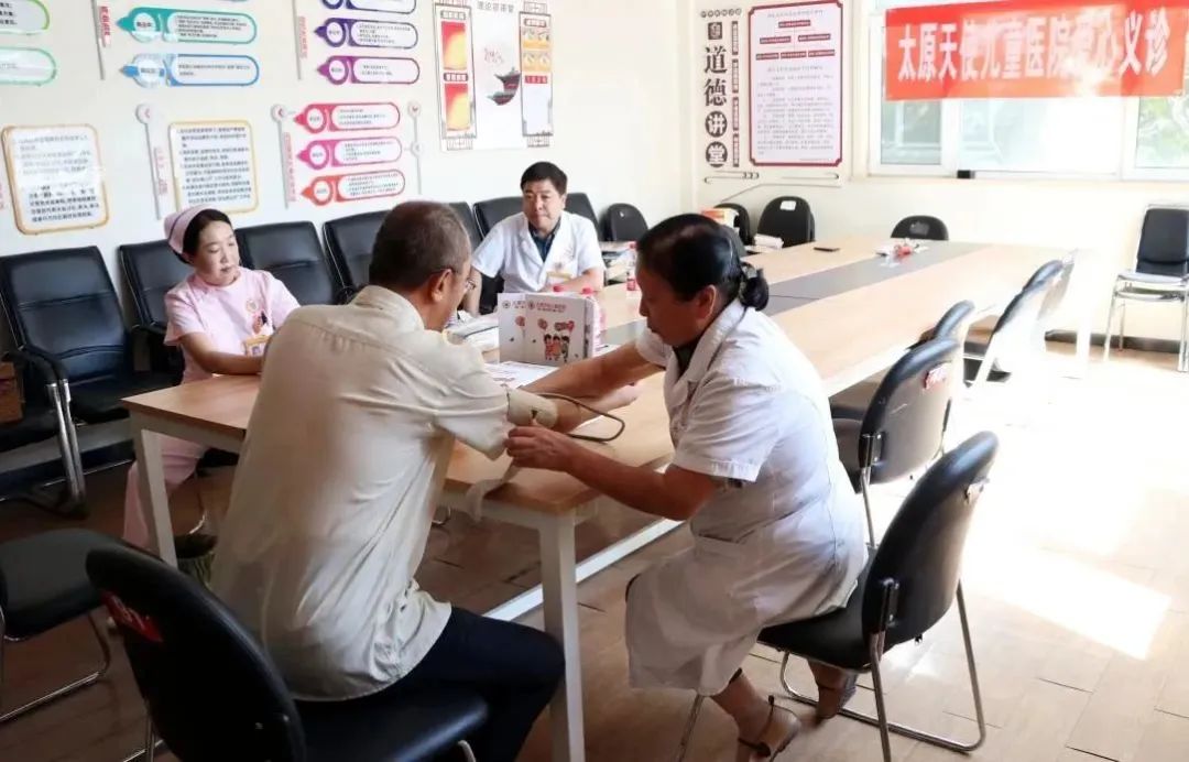 义诊现场,太原天使儿童医院医生杨捷主任带领医护人员为居民把脉问诊,杨捷主任结合多年的临床工作经验,一边为居民答疑解惑,一边详细询问就诊者的身体状况,耐心细致地检查、分析病情,并针对不同病症和个体差异给予个体化治疗方案,获得居民的一致好评。