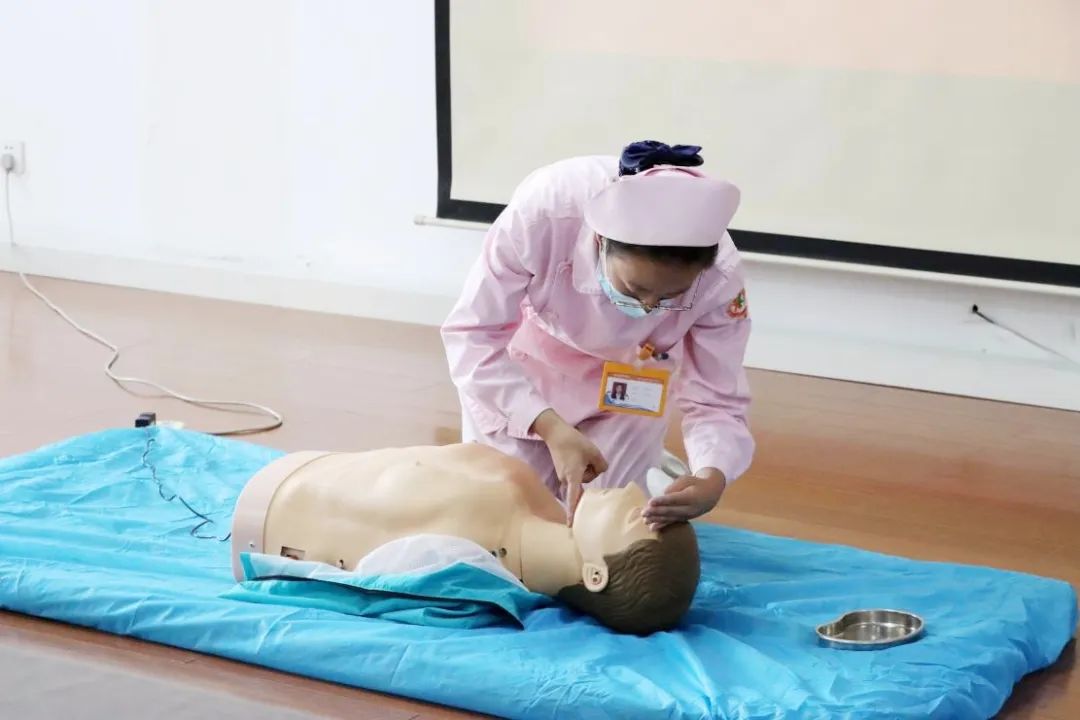会上,杨捷主任分别就生活急救和疾病急救的主要措施、基本原则、注意事项等内容通过PPT图文并茂进行了培训。并重点就心肺复苏、创伤急救的止血包扎、常见疾病的应急处理等进行了详细讲解,同时现场演示了心肺复苏急救方式,细致阐述了现场救护技巧。