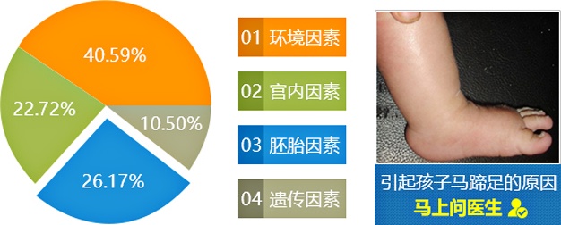 马蹄足分为先天性与后天性,原因较多。先天性马蹄足是一种发育性畸形,出生后即存在畸形,有遗传性。后天性大都为神经肌肉性疾病,由于胫前肌瘫痪造成;如儿麻后遗症、脑瘫后遗症、脑脊髓脊膜膨出、脊柱裂、神经管闭合不全、脊髓与周围神经病变与损伤、多发性神经炎等。