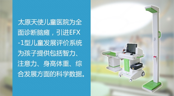 脑瘫是个复杂的疾病,寻常脑CT或核磁共振只是针对孩子病情的一个辅助检查,无法全面评估病情。太原天使儿童医院拥有专业检查设备,针对孩子脑部、智力、身体发育情况、社会生活能力、心理状态全面检查,为治疗提供科学依据。